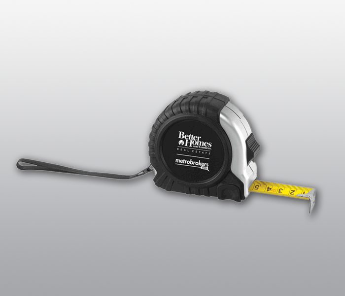 The Pro Locking Tape Measure includes a 25-foot retractable tape measure with standard and metric measurements, a rubber casing, a rubberized wrist strap and a metal belt clip. The slide locking button locks the tape in place.