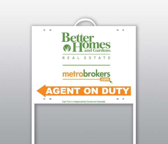 This is a tent-style, stand up sign. It is double-sided with the BHGRE Metro Brokers logo in green and orange on a white background. Sign has a handle on top for easy moving and at the bottom, the words AGENT ON DUTY are in a directional arrow.
