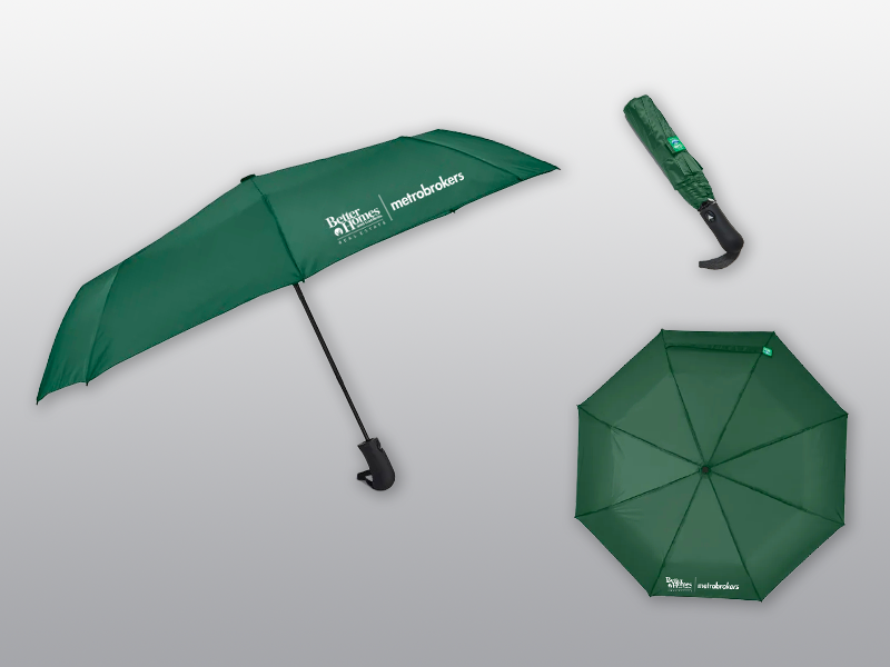 Made with eco-friendly rPET polyester. This auto-open folding umbrella has a rubberized sure grip handle and a 44" arc and is built with 3-section steel and fiberglass windproof construction!
