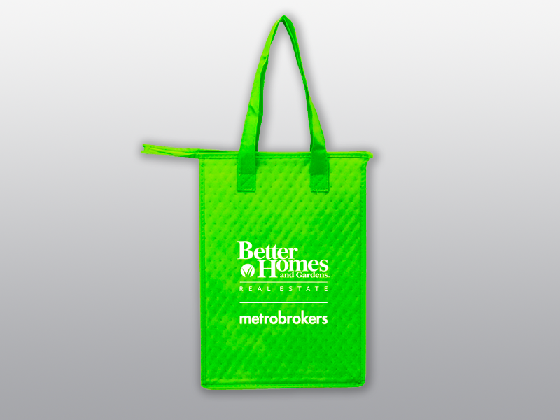 Thermal insulated green lunch tote with zipper closure, reinforced bottom panel, and long handles for easy carrying.
