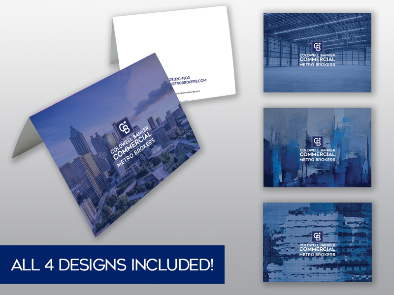 Note cards with 4 commercial images or illustrations on the front. The company logo is printed on the back. Blank interior for personalized entries.