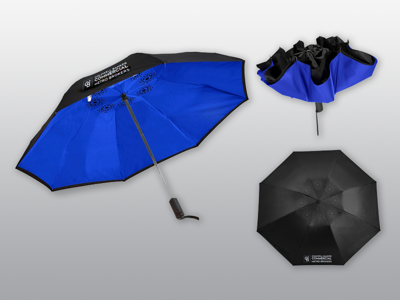Made with eco-friendly rPET polyester, this inverted auto opens and closes, double-canopy umbrella is built with a 46" arc, revolutionary inverted design, and a fiberglass frame. The Rebel 3 has a comfort-grip rubber handle.