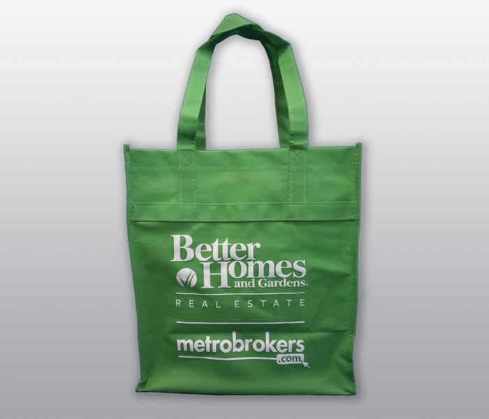 This non-woven, eco-friendly bag is 14"x13"x7". It is bright green with the white BHGRE Metro Brokers logo printed on both sides. There are dual handles on top for easy carrying and a flat bottom.