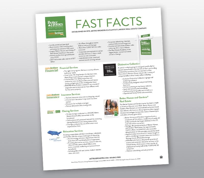 Single page flyer that overviews the company, new homes, relocation and Better Homes and Gardens Real Estate.