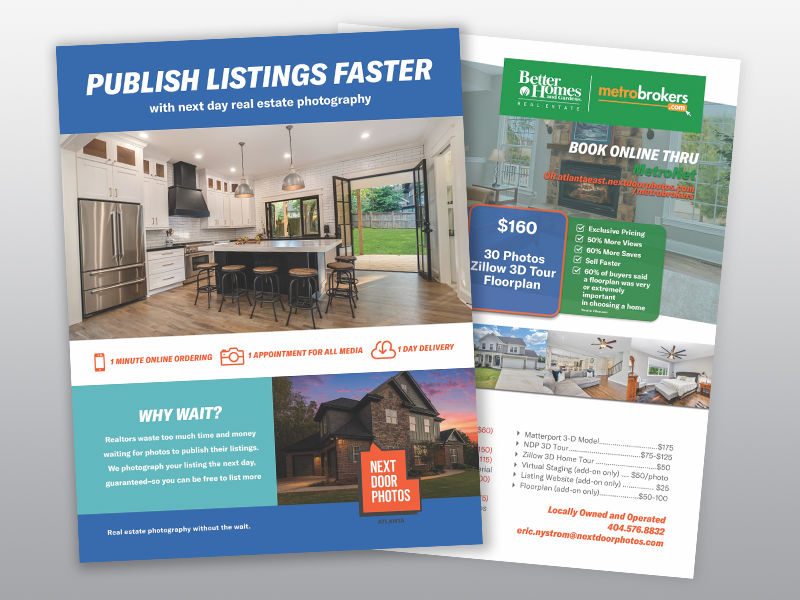 2-sided, co-branded flyer explaining who Next Door Photos is and covering package pricing and add-ons.