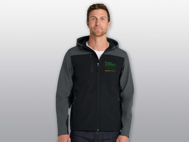 An attached hood and bold color blocking give this well-priced, wind-resistant, water-repellent soft shell extra rain-shielding protection and strong style.
