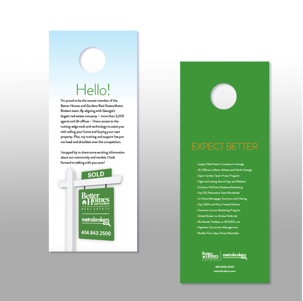 Door hangers for new agents to use as an introduction to a new area or neighborhood. Die cut for business card.