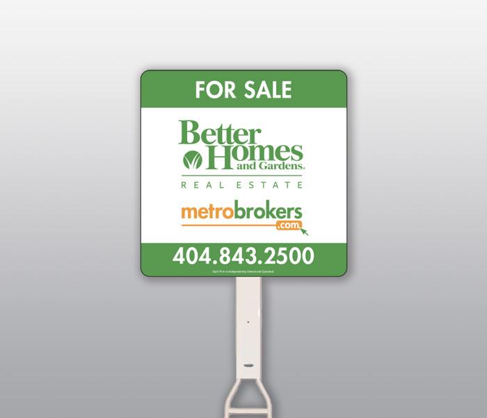White, green, and orange sign with BHGRE Metro Brokers logo. Will have "For Sale" at the top and have the Call Center phone number at the bottom.